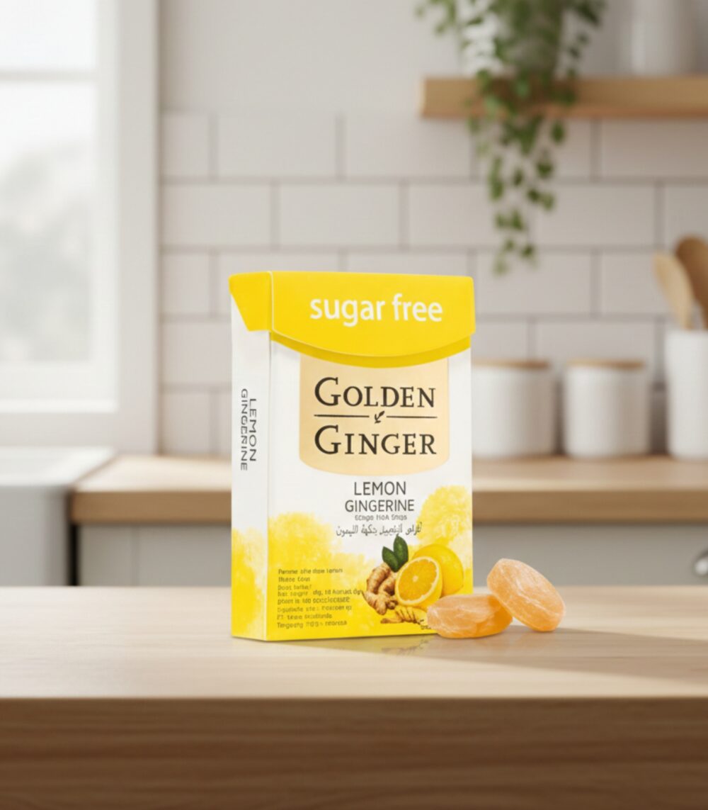 جولدن جينجر أقراص الزنجبيل بالليمون – خالي من السكر، مزيج طبيعي من الزنجبيل الدافئ والليمون المنعش، يمنحك راحة للحلق وانتعاش يدوم.