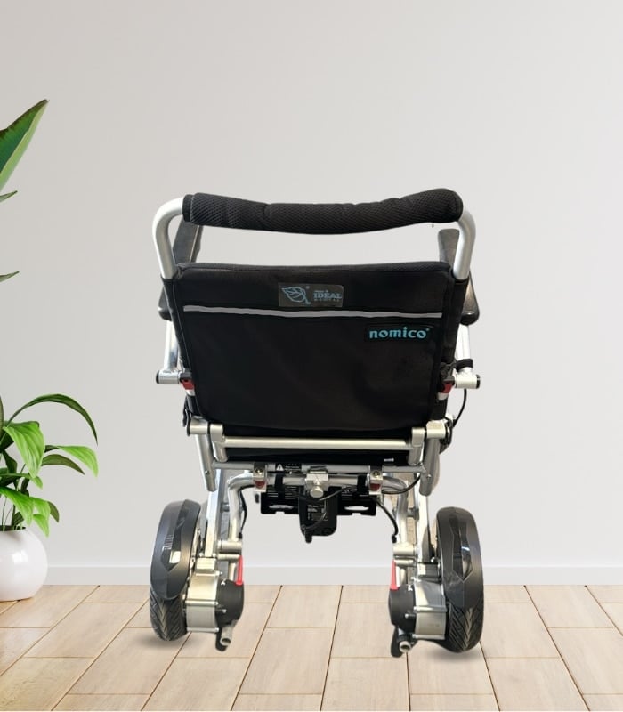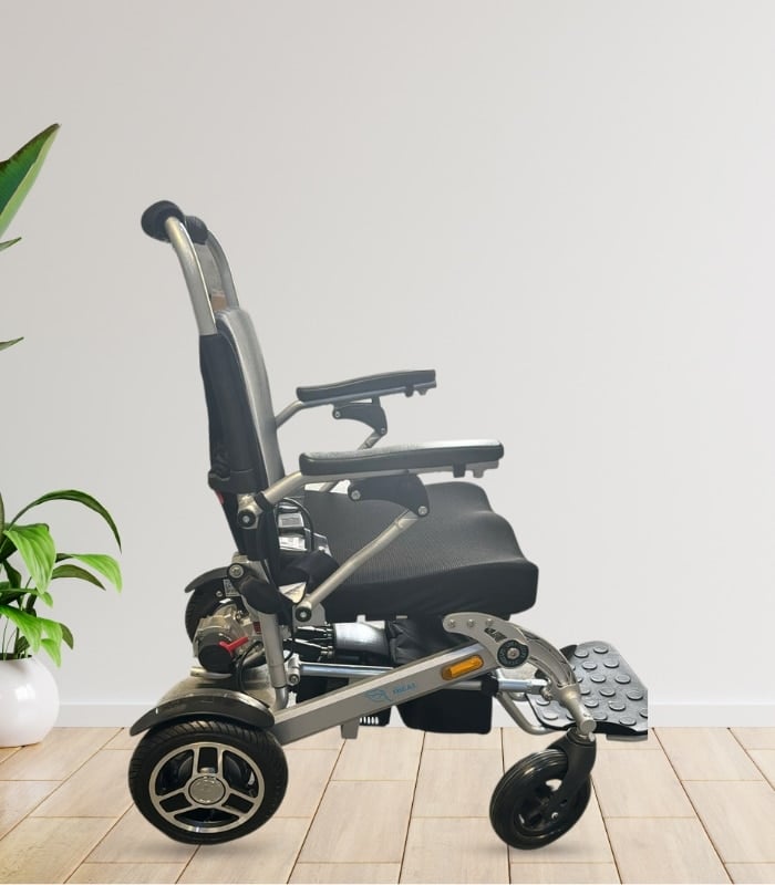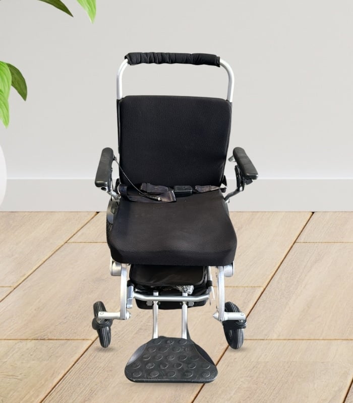 كرسي متحرك كهربائي خفيف الوزن، مزود بمقبض للتحكم بالاتجاه. يتيح للمستخدم السير وقطع مسافة تصل إلى 15 كم ببطارية كاملة الشحن. يتميز بسهولة الحمل والطي، ويحتوي على مقعد مريح مصنوع من مواد لا تسبب التقرحات.