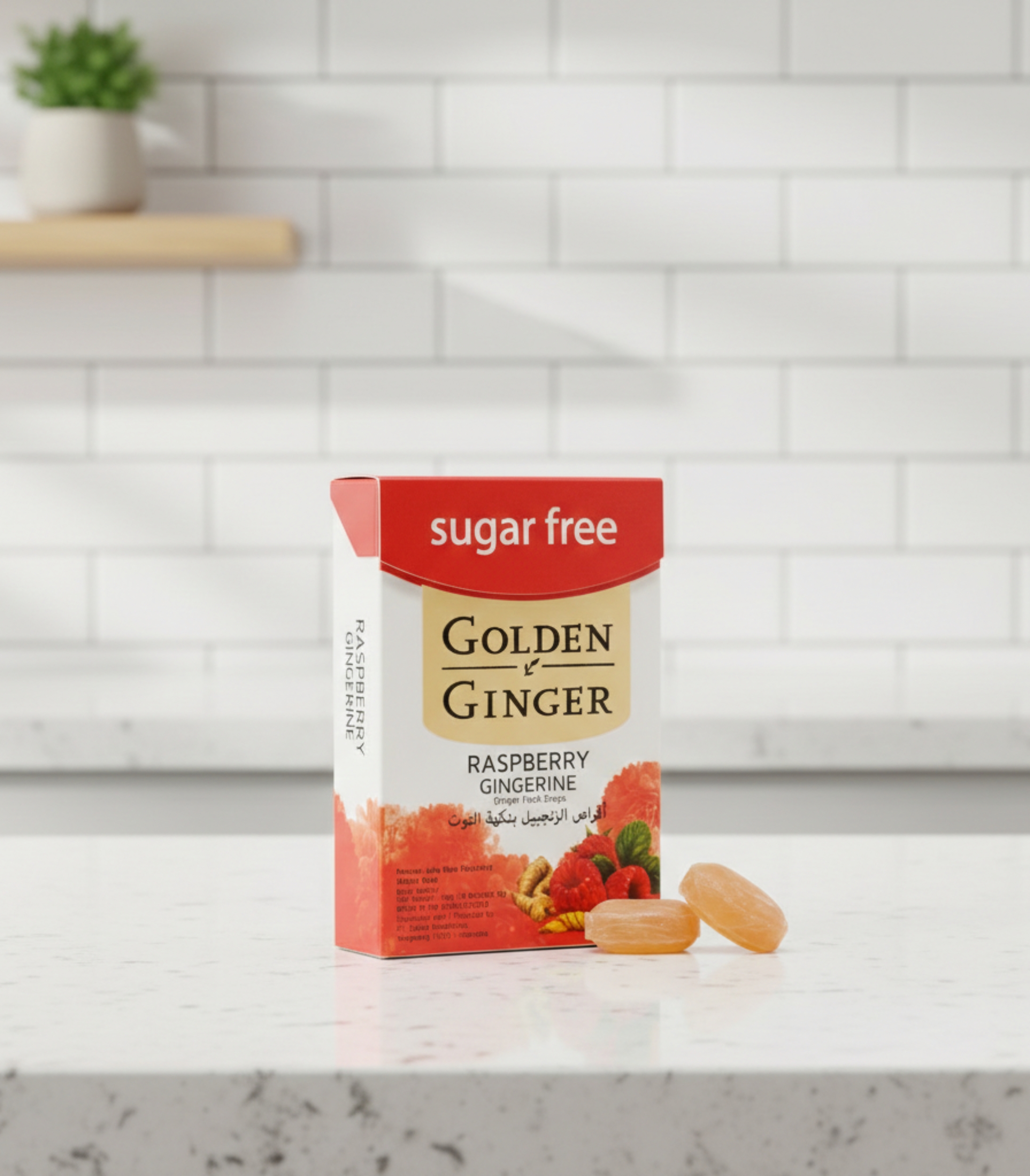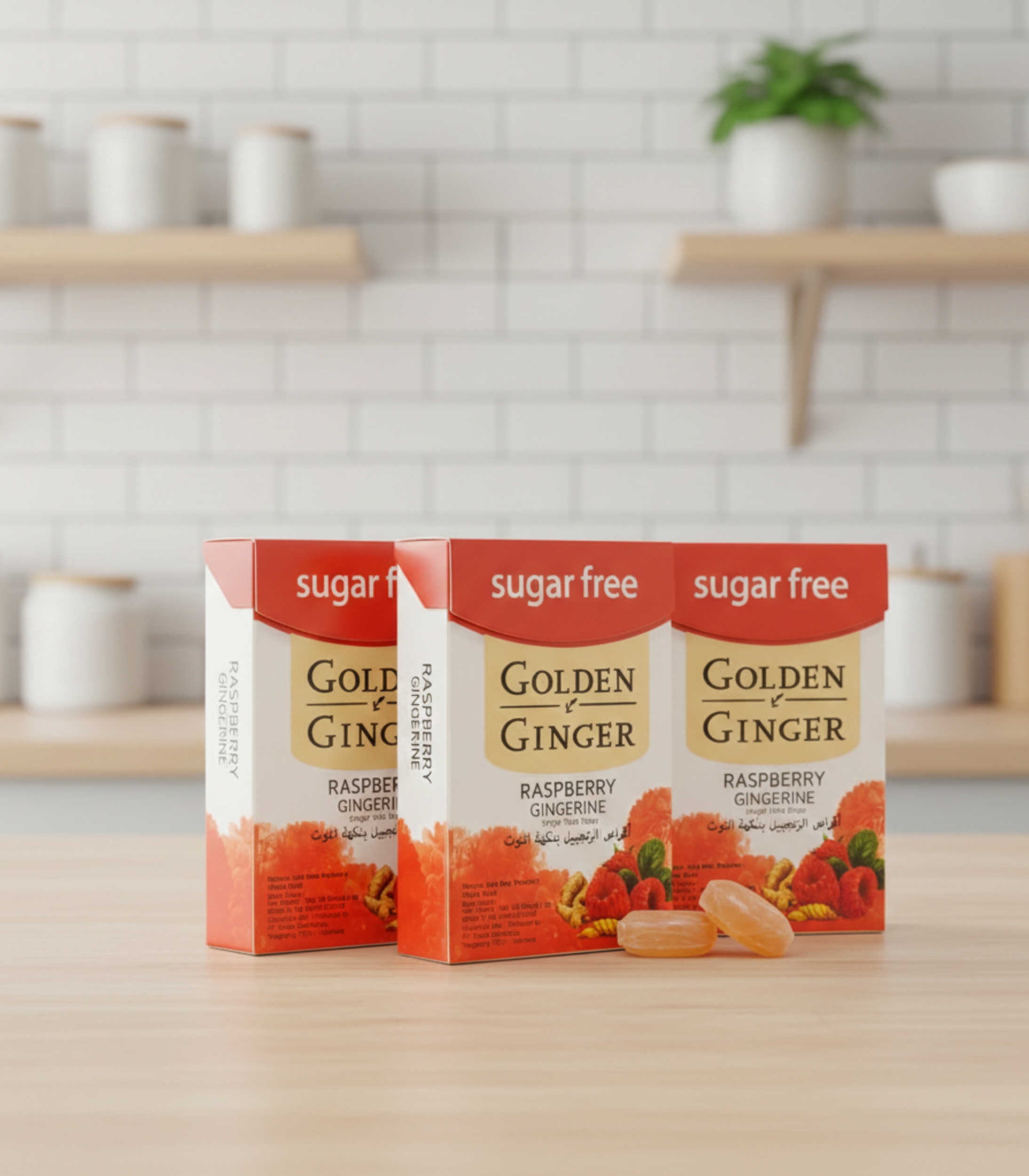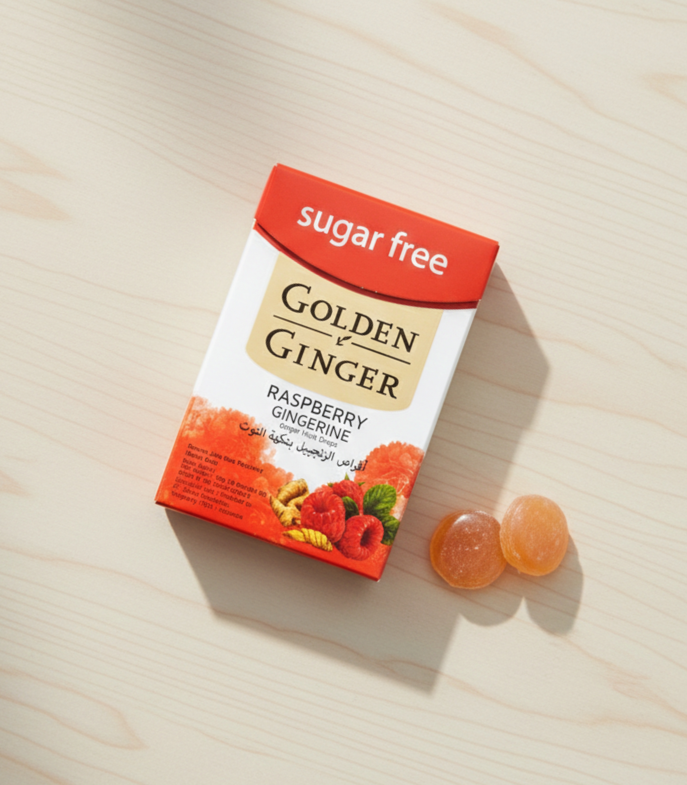 جولدن جينجر أقراص الزنجبيل بنكهة التوت – بدون سكر، مزيج منعش يهدئ الحلق ويمنحك طاقة طبيعية.