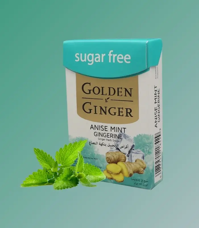 انتعش مع جولدن جينجر أقراص الزنجبيل بنكهة النعناع بدون سكر – مزيج طبيعي يهدئ الحلق ويمنحك نفسًا منعشًا.