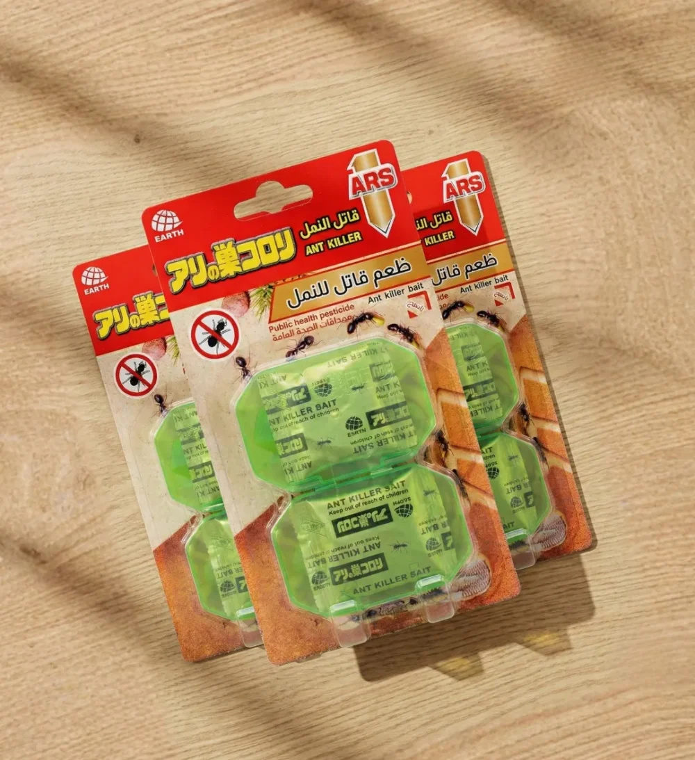 آرس قاتل للنمل ARS ANT KILLER هو حل منزلي متطور للقضاء على جميع أنواع النمل داخل المنزل وحوله. يعتمد المنتج على طُعم غذائي جاذب يعمل على استدراج النمل ليعود به إلى العش، مما يؤدي إلى القضاء على المستعمرة بالكامل خلال فترة قصيرة. يأتي المنتج من شركة Earth Corporation التايلاندية، المعروفة عالمياً بابتكار حلول فعّالة لمكافحة الحشرات المنزلية.