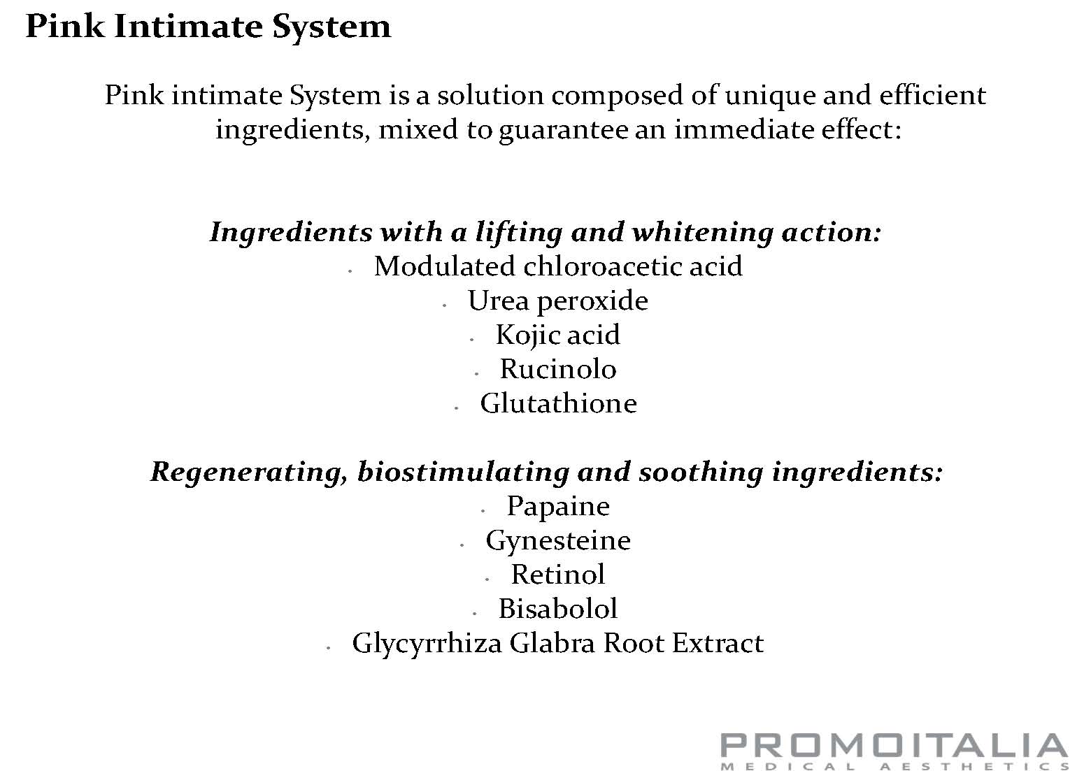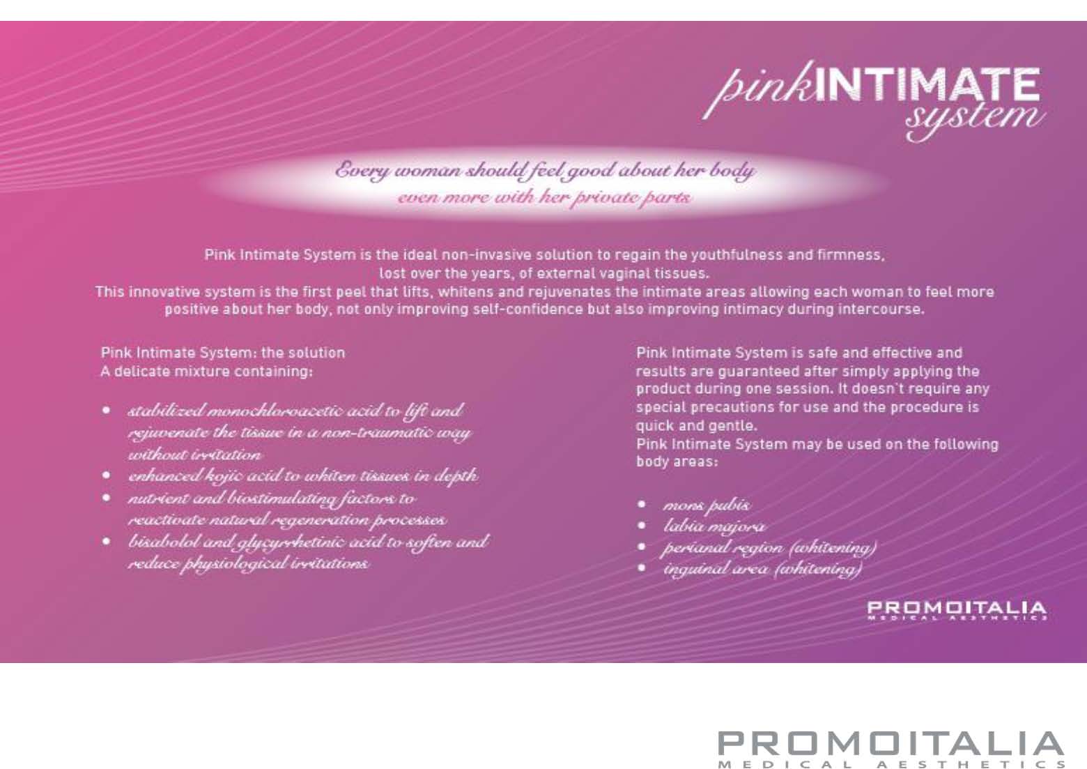 The Pink Intimate System is a premier, non-surgical cosmetic treatment meticulously crafted by Promoitalia to rejuvenate and enhance the appearance of delicate feminine zones. By promoting a more youthful skin texture and tone, this solution empowers women to embrace their bodies with renewed poise and self-assurance.