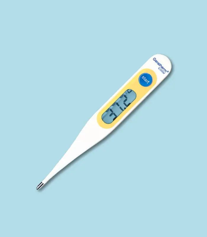 جهاز قياس الحرارة الرقمي – GERATHERM، يعمل بنظام ديجيتال، وهو الطريقة الأكثر دقة لقياس درجة حرارة الأطفال. يتميز بشاشة عرض كبيرة وواضحة تعرض 4 أرقام، مع خلفية مضيئة لقراءة مريحة حتى في الظلام.
