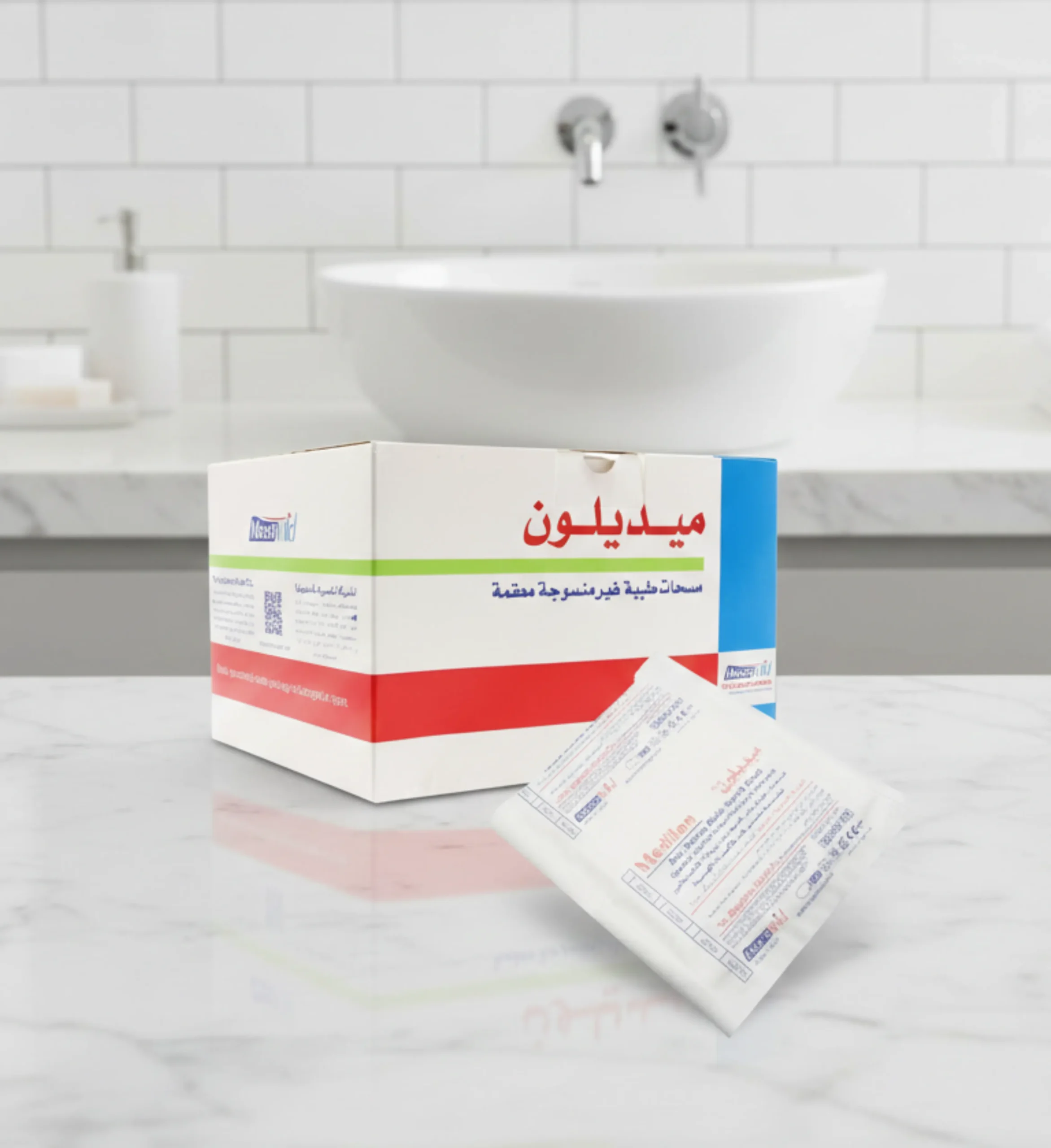 تتكون مسحات ميديلون من نسيج طبي مركب فائق الامتصاص وخالٍ من الشوائب الكيميائية التي قد تسبب الحساسية. يتم إنتاج هذا المنتج بواسطة شركة ماسكوميد (الشركة المصرية السعودية)، وهي كيان رائد يطبق أعلى معايير الرقابة الصحية، مما يجعل منتجاتها الخيار المفضل للمؤسسات الطبية الكبرى.