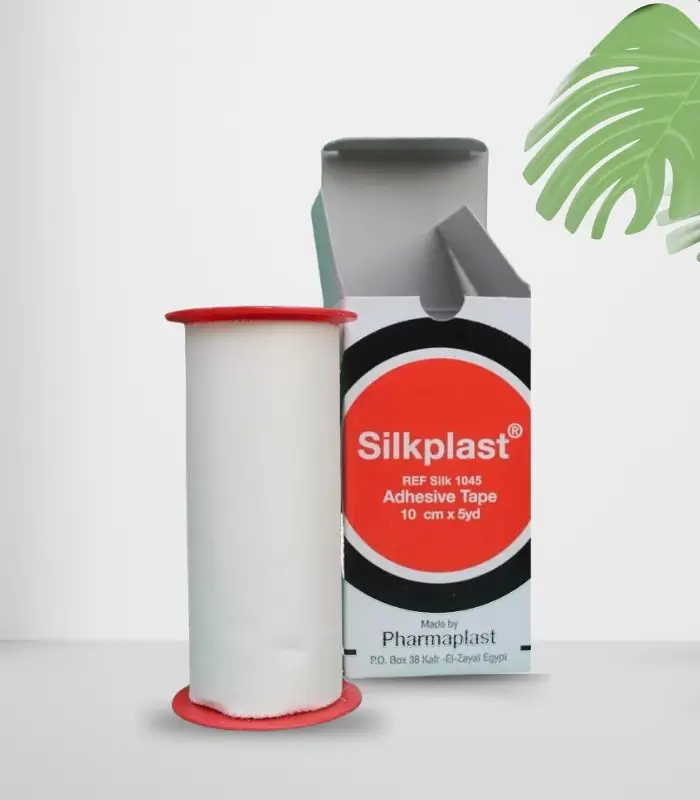رول حرير طبي 10 سم × 5 متر من فارما سيلك بلاست، مصمم لتثبيت الضمادات الكبيرة بلطف وأمان، بخامة حريرية ناعمة تسمح بالتهوية وتعزز شفاء البشرة.